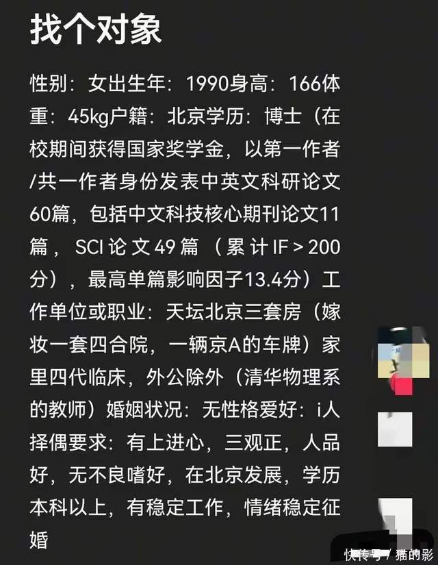 她的择偶要求一公布,更是让不少人直呼 “太亲民”。不要求男方有房有车,只需要本科及以上学历,年龄在 25 到 35 岁之间,三观正、人品好、有上进心,没有不良嗜好,情绪稳定,有稳定工作并且愿意在北京长期发展定居就行。就算男方现在在北京没有工作,也愿意一起奋斗,这样的要求,对比她的自身条件,简直可以用 “没要求” 来形容。